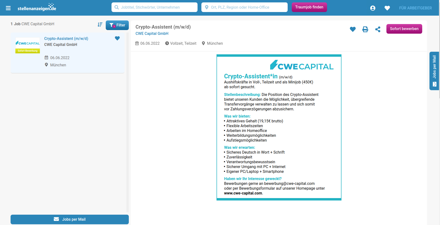 Die Bewerber werden dann gebeten Crypto Transaktionen über ihr privates deutsches Bankkonto auszuführen. Angeblich erhält man nach der Probezeit dann ein Geschäftskonto bei der N26 Bank. Dies ist eine Lüge und Sie werden auch weiterhin nur für illegale Geldwäsche missbraucht.